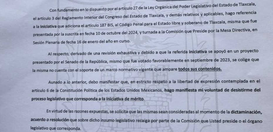 Lo anterior, aseguró la legisladora en estricto respeto a la libertad de expresión contemplada en la Constitución Política de los Estados Unidos Mexicanos. El oficio se refiere a la iniciativa en la que propuso una reforma y adición al Artículo 187 BIS al Código Penal para el Estado Libre y Soberano de Tlaxcala, en la que buscaba tipificar como delito, la difusión indebida de imágenes relacionadas con procesos penales.