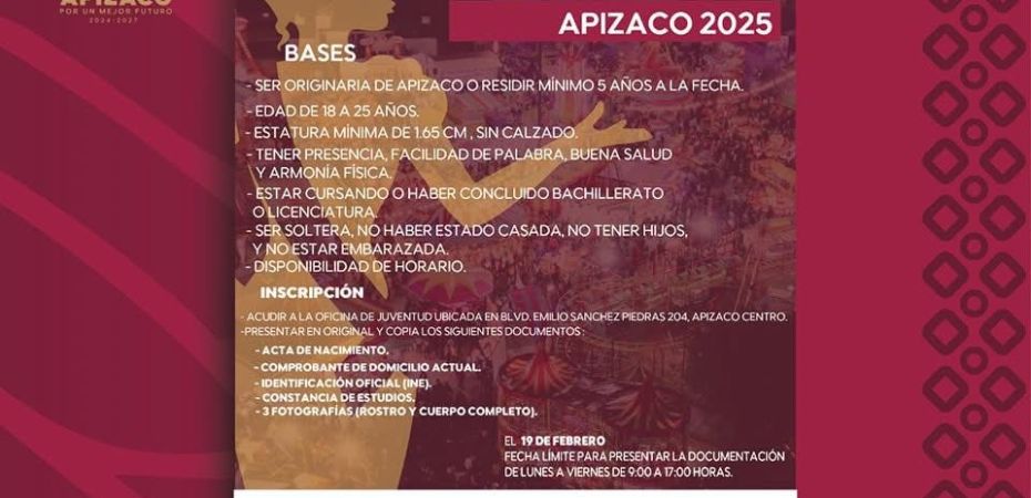 El H. Ayuntamiento de Apizaco invita a todas las jóvenes interesadas en representar a nuestro municipio a postularse y vivir una experiencia única, llena de aprendizaje y crecimiento personal.
