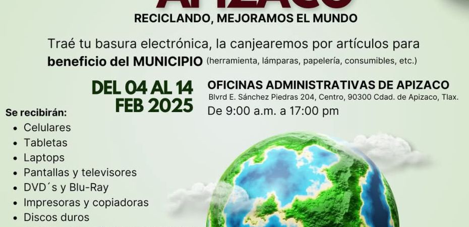 El gobierno municipal encabezado por Javier Rivera Bonilla, invita a la ciudadanía a llevar a canjear sus residuos electrónicos (celulares, tabletas, laptops, pantallas, televisores, DVD’S, Blu-Ray, impresoras, copiadoras, discos duros, equipos de audio, bocinas, fax, teléfonos fijos, módems, audífonos, cargadores, cables, reguladores, etc).
