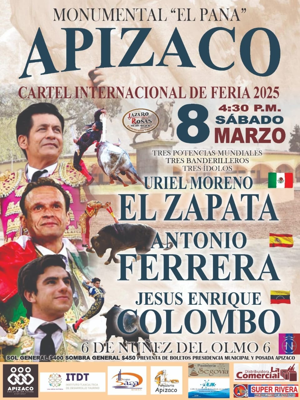 Se anuncia para el sábado 8 de marzo a las 4:30 de la tarde en la Plaza de Toros Monumental Rodolfo Rodríguez «El Pana» de Apizaco, Tlaxcala, a los matadores Antonio Ferrera de España, Uriel Moreno «El Zapata» de México y Jesús Enrique Colombo de Venezuela.