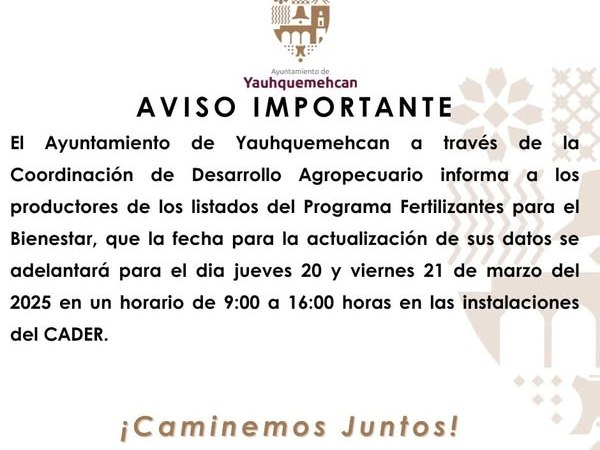 Con el objetivo de beneficiar a los productores locales, el Ayuntamiento de Yauhquemehcan anunció la actualización de datos del Programa Fertilizantes para el Bienestar para los días 20 y 21 de marzo de 2025. Este importante trámite se realizará de 9:00 a 16:00 horas en el CADER, con el propósito de facilitar el acceso de los agricultores al programa.