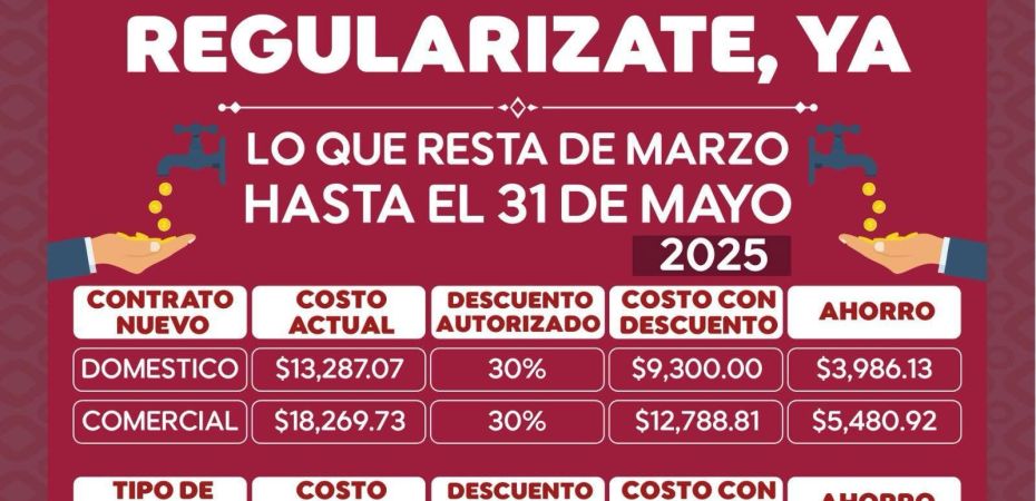 El Gobierno de Apizaco, encabezado por el presidente municipal Javier Rivera Bonilla, a través de la Comisión de Agua Potable y Alcantarillado (CAPAMA), dio a conocer el programa “REGULARÍZATE YA”, el cual estará vigente del 14 de marzo al 31 de mayo del 2025.