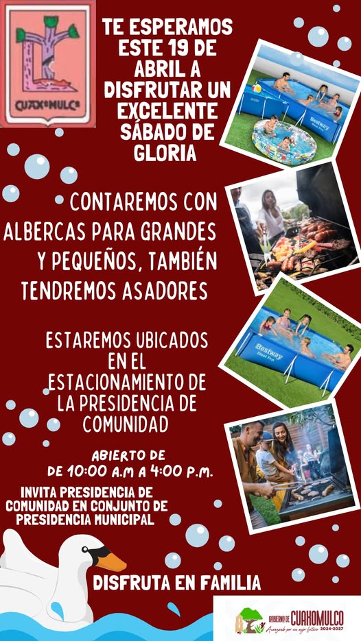 El Gobierno Municipal de Cuaxomulco y la presidencia de comunidad están preparando un día que promete quedarse en el corazón de los vecinos. Este 19 de abril, las familias podrán disfrutar de un sábado de gloria lleno de albercas, asadores y momentos especiales para compartir.