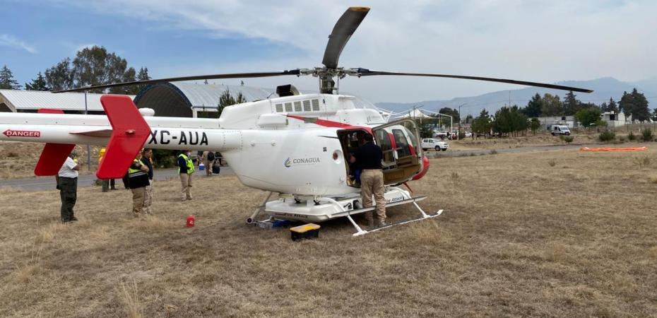 Esta mañana, se sumó un helicóptero de CONAGUA a las labores de combate al incendio en Atltzayanca; esta aeronave permitirá reforzar las labores que se realizan desde el martes en el cerro de San Gabriel.