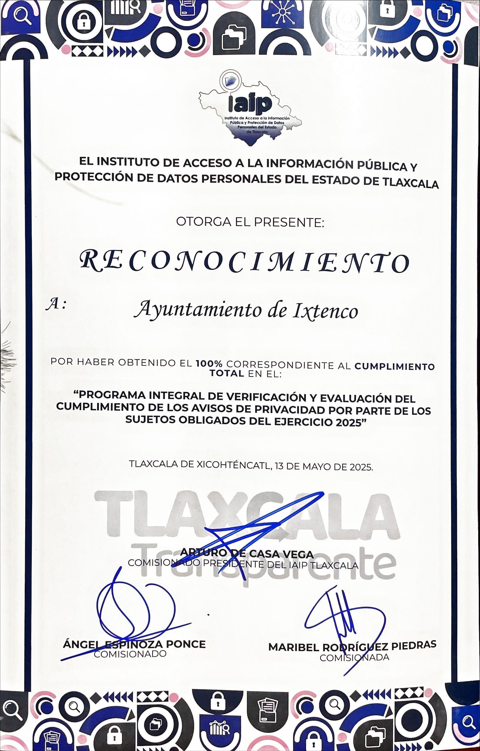 El Gobierno Municipal de Ixtenco, encabezado por la presidenta municipal Aline Lazo Caballero, fue reconocido este 13 de mayo de 2025 por el Instituto de Acceso a la Información Pública y Protección de Datos Personales del Estado de Tlaxcala (IAIP) por haber obtenido el 100% de cumplimiento en el Programa de Verificación de las Obligaciones de Transparencia del primer semestre del ejercicio 2025, así como en el Programa Integral de Verificación y Evaluación del Cumplimiento de los Avisos de Privacidad.
