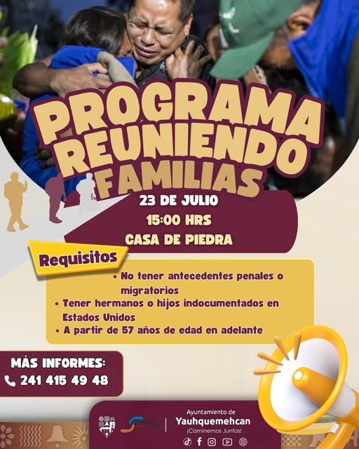 Mañana martes 23 de julio a las 15:00 horas se llevará a cabo una reunión informativa del programa Reuniendo Familias en la Casa de Piedra, organizada por el Ayuntamiento de Yauhquemehcan en coordinación con la Fundación Jalisco.