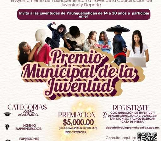 El Ayuntamiento de Yauhquemehcan, a través de la Coordinación de Juventud y Deporte, abrió la convocatoria para el Premio Municipal de la Juventud 2025, un galardón que busca reconocer a las y los jóvenes que destacan por su talento, compromiso y aportaciones a la comunidad.