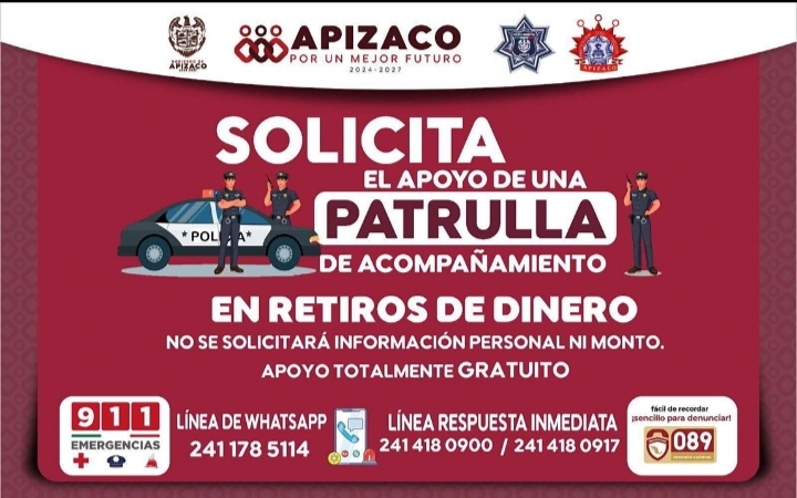 La Dirección de Seguridad Pública de Apizaco recuerda a la ciudadanía que está disponible el apoyo de acompañamiento bancario para realizar retiros o depósitos de manera segura en cualquier institución bancaria del municipio. Este servicio es totalmente gratuito y tiene como objetivo brindar seguridad y tranquilidad a los ciudadanos al realizar transacciones bancarias.