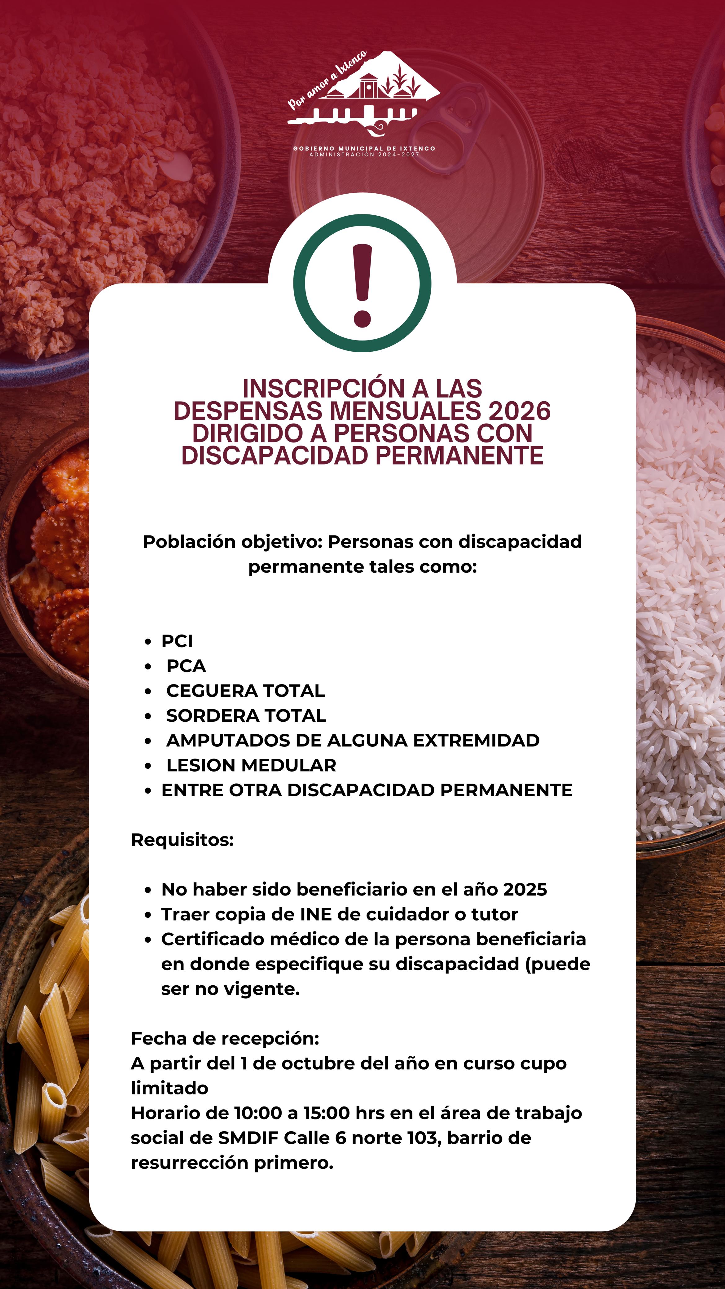 El H. Ayuntamiento de Ixtenco, encabezado por la presidenta municipal Aline Lazo Caballero, en coordinación con el Sistema Municipal para el Desarrollo Integral de la Familia (SMDIF), que preside de manera honorífica Alicia Caballero Yonca y dirige Raúl Hernández Gaspar, anunció la apertura del Programa de Despensa Mensual 2026, el cual está dirigido a personas con discapacidad permanente.