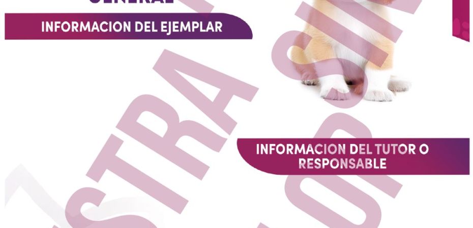 La Cédula incluye datos relevantes del ejemplar como especie, género, edad, talla, raza, color predominante, así como los datos de contacto del tutor responsable.