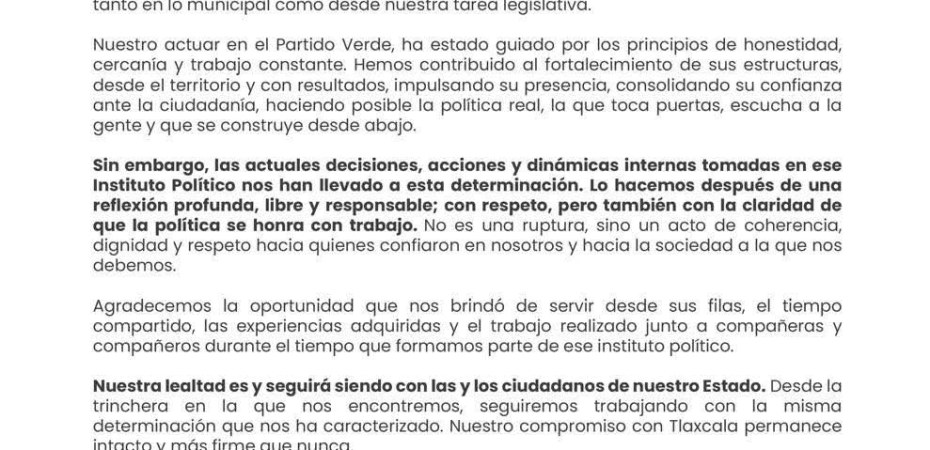 Ambos diputados aprovecharon el comunicado para agradecer las experiencias adquiridas dentro del PVEM, así como el trabajo conjunto realizado con compañeras y compañeros de partido. Recalcaron que su lealtad seguirá siendo con la ciudadanía de Tlaxcala y que mantendrán su compromiso de trabajar con la misma determinación desde cualquier trinchera.