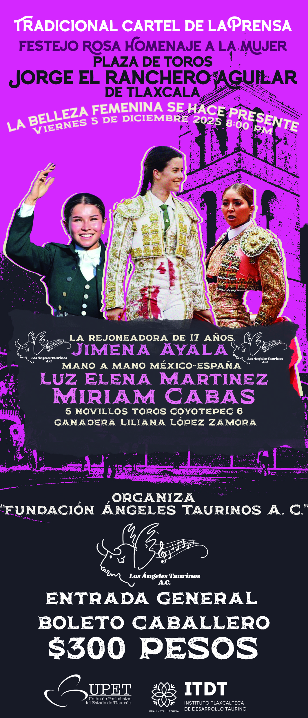 La Unión de Periodistas del Estado de Tlaxcala (UPET), junto con la Fundación Ángeles Taurinos y el Instituto Tlaxcalteca de Desarrollo Taurino (ITDT), presentó este miércoles el “Cartel Rosa de la Prensa”, un festejo taurino 100 % femenil que se celebrará el próximo viernes 5 de diciembre a las 20:00 horas en la Plaza de Toros “Jorge El Ranchero Aguilar”, de la capital tlaxcalteca.