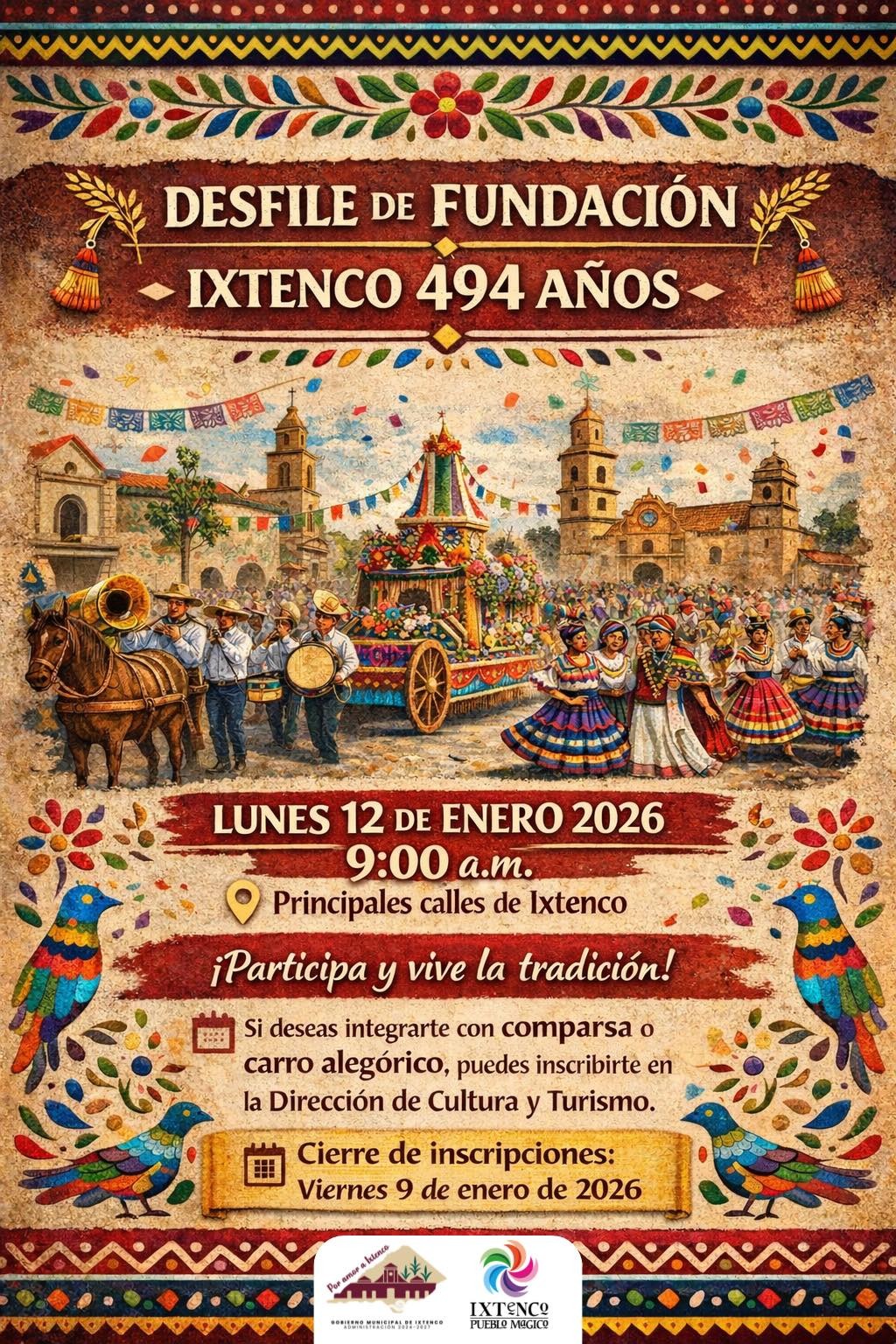 El programa culminará con el Gran Desfile de Fundación, que se realizará el lunes 12 de enero de 2026, a partir de las 9:00 a.m., recorriendo las principales calles de Ixtenco. La Presidenta Municipal invitó a instituciones, grupos culturales y ciudadanía en general a sumarse a esta celebración. Quienes deseen participar con comparsa o carro alegórico podrán inscribirse en la Dirección de Cultura y Turismo hasta el viernes 9 de enero de 2026. “Estos eventos reflejan nuestra identidad como Pueblo Mágico, fortalecen nuestras tradiciones y nos unen como pueblo”, destacó la Presidenta Municipal.