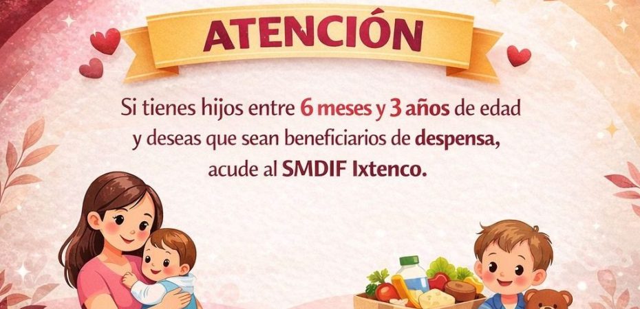 El Sistema Municipal para el Desarrollo Integral de la Familia (SMDIF) Ixtenco anunció el inicio del periodo de recepción de documentos para que niñas y niños de 6 meses a 3 años de edad puedan ser beneficiarios del programa de apoyo de despensa, dirigido a fortalecer la nutrición y bienestar de la primera infancia en el municipio.