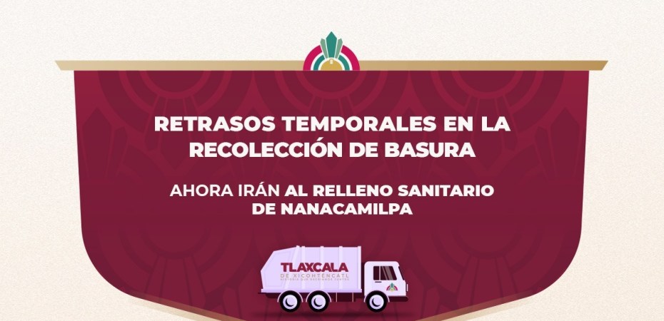 El Ayuntamiento de Tlaxcala informa a la ciudadanía que, derivado de una disposición de la Secretaría del Medio Ambiente del Estado, de manera temporal los residuos sólidos urbanos ya no podrán ser trasladados al sitio de disposición final ubicado en el municipio de Tetla, por lo que actualmente deberán llevarse al municipio de Nanacamilpa.