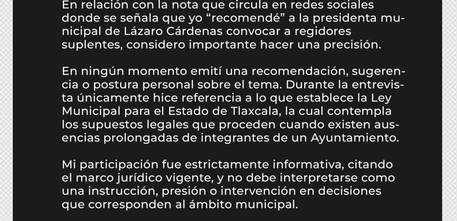 Caballero Yonca señaló que, dentro de esa explicación, hizo referencia a lo que establece la Ley Municipal para el Estado de Tlaxcala, la cual contempla diversos supuestos legales relacionados con las ausencias de integrantes de un ayuntamiento. Subrayó que esta mención se dio como parte de una exposición jurídica general y no como una sugerencia dirigida a autoridad alguna.