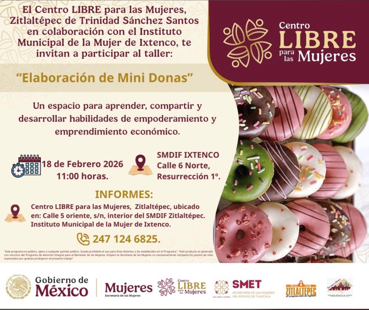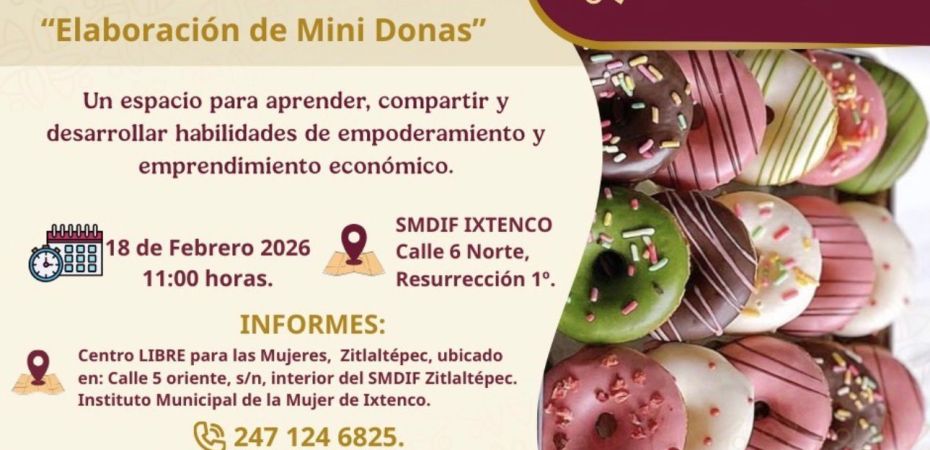 Con el objetivo de impulsar el autoempleo y el emprendimiento económico de las mujeres, el Centro LIBRE para las Mujeres de Zitlaltepec de Trinidad Sánchez Santos, en coordinación con el Instituto Municipal de la Mujer de Ixtenco, invita a las mujeres del municipio a participar en el taller gratuito “Elaboración de Mini Donas”.