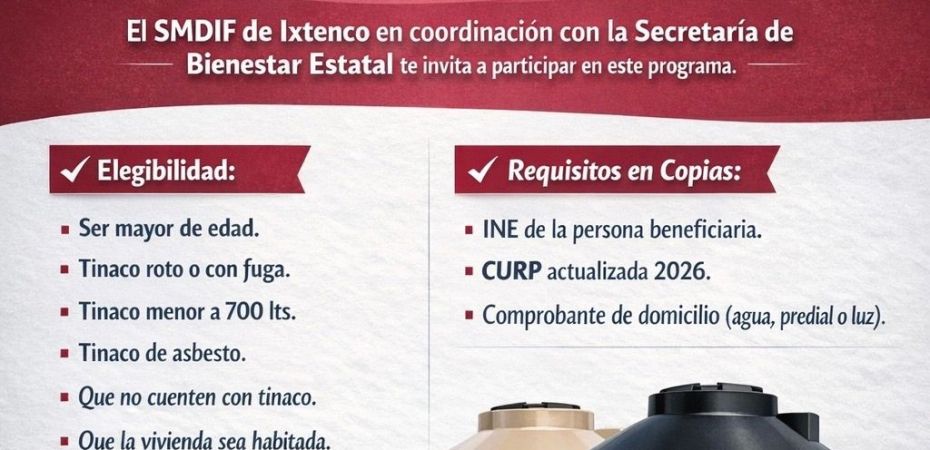 Con el objetivo de mejorar las condiciones de almacenamiento de agua potable en viviendas que presentan carencias, el Gobierno Municipal de Ixtenco, encabezado por la presidenta municipal Aline Lazo Caballero, en coordinación con la Secretaría de Bienestar Estatal, puso en marcha la convocatoria del programa “Tinacos Gratuitos para tu Bienestar 2026”.
