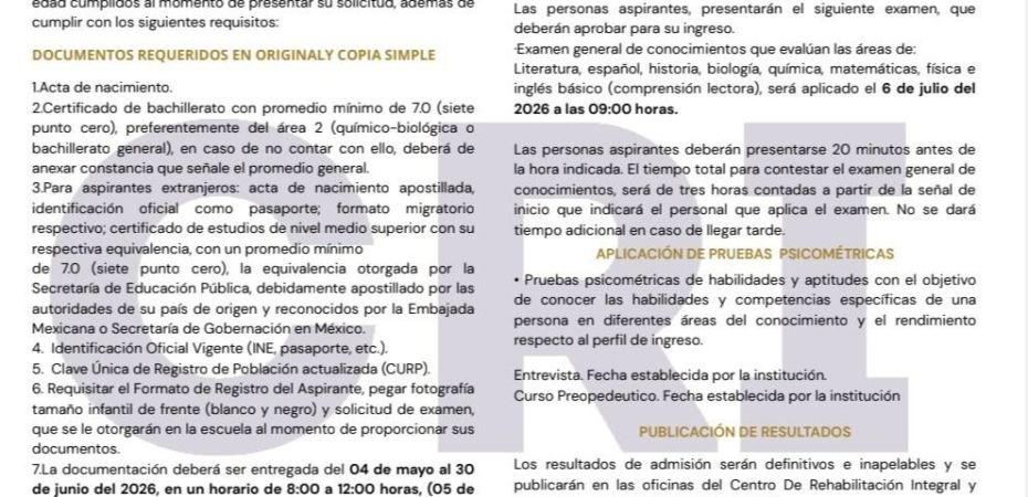 Como parte del proceso, los aspirantes deberán entregar su documentación del 4 de mayo al 30 de junio, en un horario de 8:00 a 12:00 horas. Entre los requisitos se incluyen acta de nacimiento, certificado de estudios, identificación oficial, CURP, formato de registro con fotografía y el pago de mil pesos por concepto de ficha.