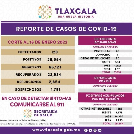 REGISTRA SESA 120 CASOS POSITIVOS Y CERO DEFUNCIONES DE COVID-19 EN TLAXCALA