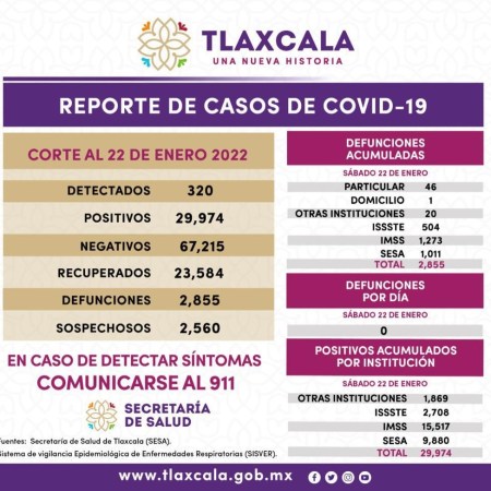 REGISTRA SESA 22 CASOS POSITIVOS Y CERO DEFUNCIONES DE COVID-19 EN TLAXCALA
