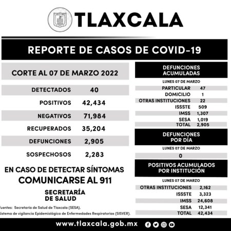 REGISTRA SESA 40 CASOS POSITIVOS Y CERO DEFUNCIONES DE COVID-19 EN TLAXCALA