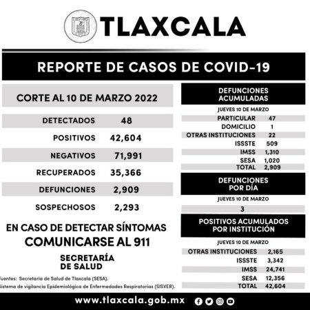 REGISTRA SESA 48 CASOS POSITIVOS Y TRES DEFUNCIONES DE COVID-19 EN TLAXCALA