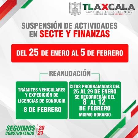 DEL 25 DE ENERO AL 5 DE FEBRERO SUSPENDEN SECTE Y FINANZAS ATENCIÓN AL PÚBLICO